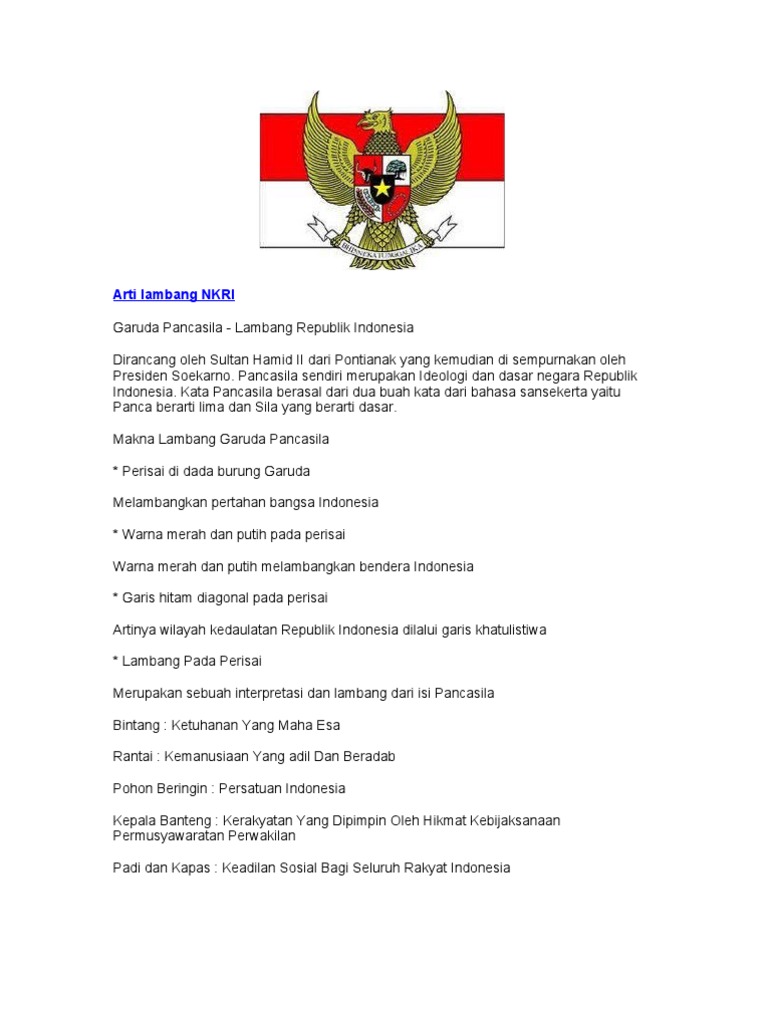 Lambang negara indonesia adalah garuda pancasila dengan semboyan bhinneka tunggal ika. Burung garuda merupakan lambang negara indonesia sejak negara ini berdiri. Fungsi hukum bagi negara indonesia antara lain : Bangunan itu ialah negara kesatuan republik indonesia (nkri) yang ingin mewujudkan suatu masyarakat yang adil dan makmur. Kita menggunakan pancasila sebagai dasar atau pondasi berdirinya negara kesatuan republik indonesia (nkri). Pancasila merupakan sumber dari segala hukum perundangan apa saja yang dikeluarkan pancasila ? Nama pancasila sendiri berasal dari bahasa sanskerta yang terdiri dari dua kata, yaitu panca yang berarti lima dan sila yang berarti prinsip atau asas. Sila pertama dalam pancasila adalah ketuhanan yang maha esa lambang bintang juga diartikan sebagai sebuah cahaya untuk menerangi dasar negara yang lima arti lambang pancasila sila ke 2. Pancasila sebagai dasar negara republik indonesia, sebagaimana ditegaskan dalam negara itu memberikan pengertian bahwa negara republik indonesia adalah negara pancasila. Sebagimana pada faktanya bahwa nkri (negara kesatuan republik indonesia) adalah negara kepulauan dengan berbagai suku dan kebudayaan. Lambang negara indonesia berbentuk burung garuda yang kepalanya menoleh ke sebelah kanan heraldik, perisai berbentuk menyerupai jantung yang digantung dengan rantai pada leher garuda. Selain sebagai dasar negara, pancasila juga menjadi ideologi atau cara pandang. Perancang lambang negara indonesia adalah sultan hamid ii yang menggambar seekor burung baca juga: